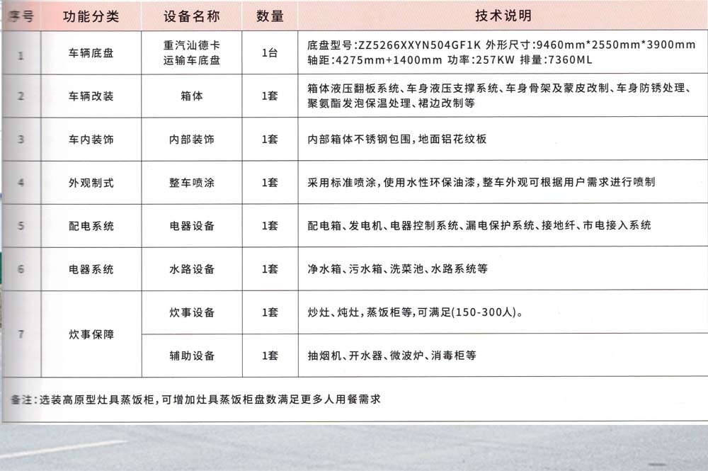 一、底盤(pán)配置: 采用重汽ZZ5266XXYN504GF1K車身,配置濰柴發(fā)動(dòng)機(jī)350馬力,國(guó)六排放標(biāo)準(zhǔn),軸距4275+1400(mm),整備質(zhì)量14.87噸,額定載質(zhì)量1.000935噸,陜齒十擋變速箱,帶原廠空調(diào),該車上黃牌,城區(qū)道路請(qǐng)注意限行標(biāo)識(shí)。