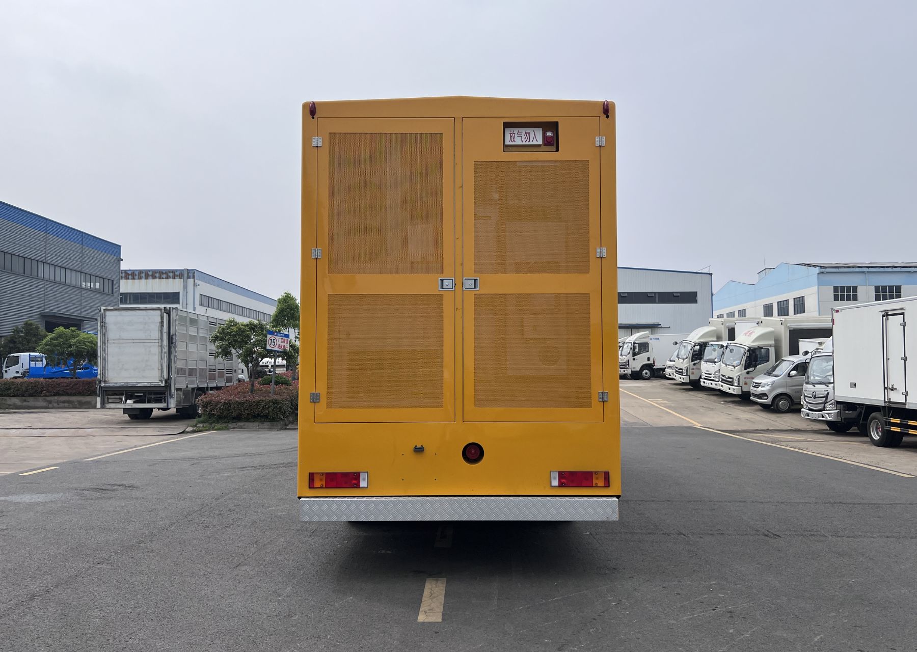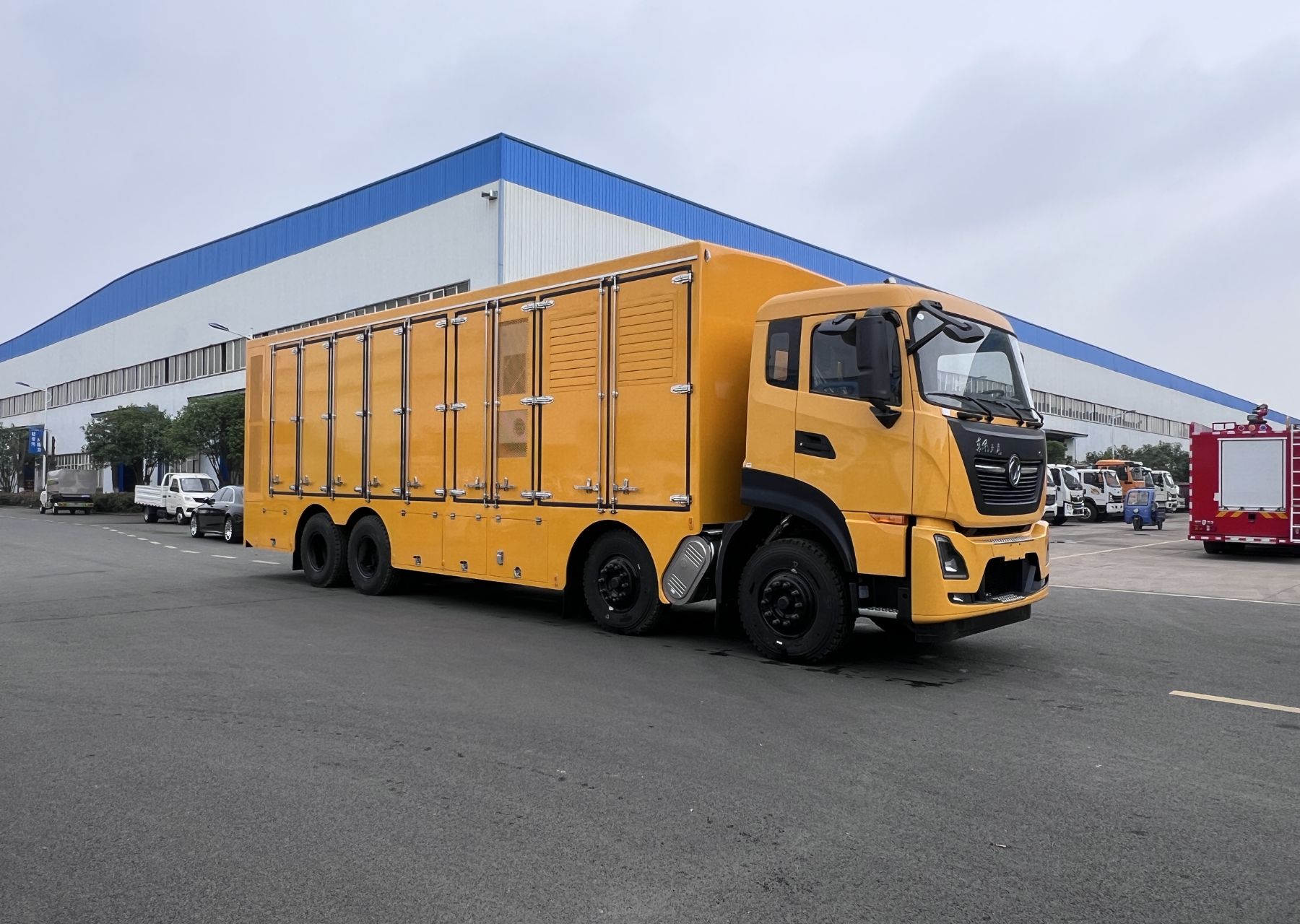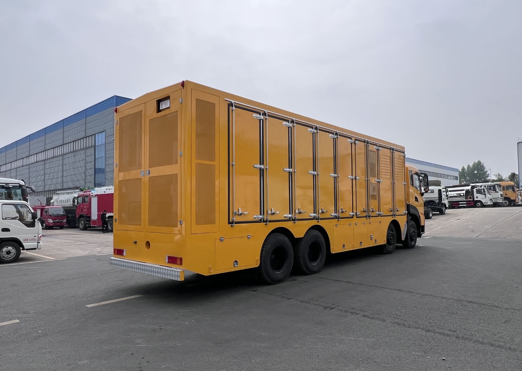 一、底盤配置: 采用東風DFH1310A9車身,配置玉柴DDi75E340-60發動機250KW馬力,國六排放標準,軸距1995+4600+1350(mm),整備質量30.87噸,額定載質量0噸,五擋變速箱,帶動力轉向,帶原廠空調,該車廂內裝有發電機組,變壓器,散熱設備等,主要用于處理突發事件的應急搶險供電;車廂頂部封閉且不可開啟;隨底盤選裝駕駛室,選裝限速裝置,限速89km/h;側面防護裝置材料:Q235B碳鋼,裙邊結構;后部防護裝置材料:Q235B碳鋼.連接方式:采用螺栓連接.后部防護斷面尺寸(寬×高)(mm):80×160,后部防護離地高度(mm):480;該車上黃牌,城區道路請注意限行標識。