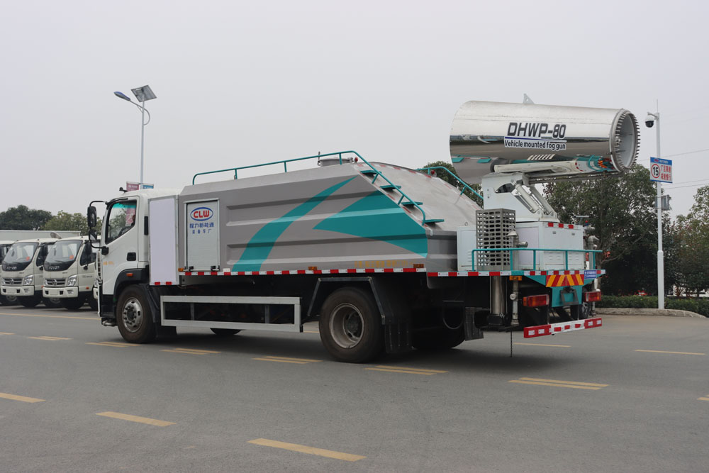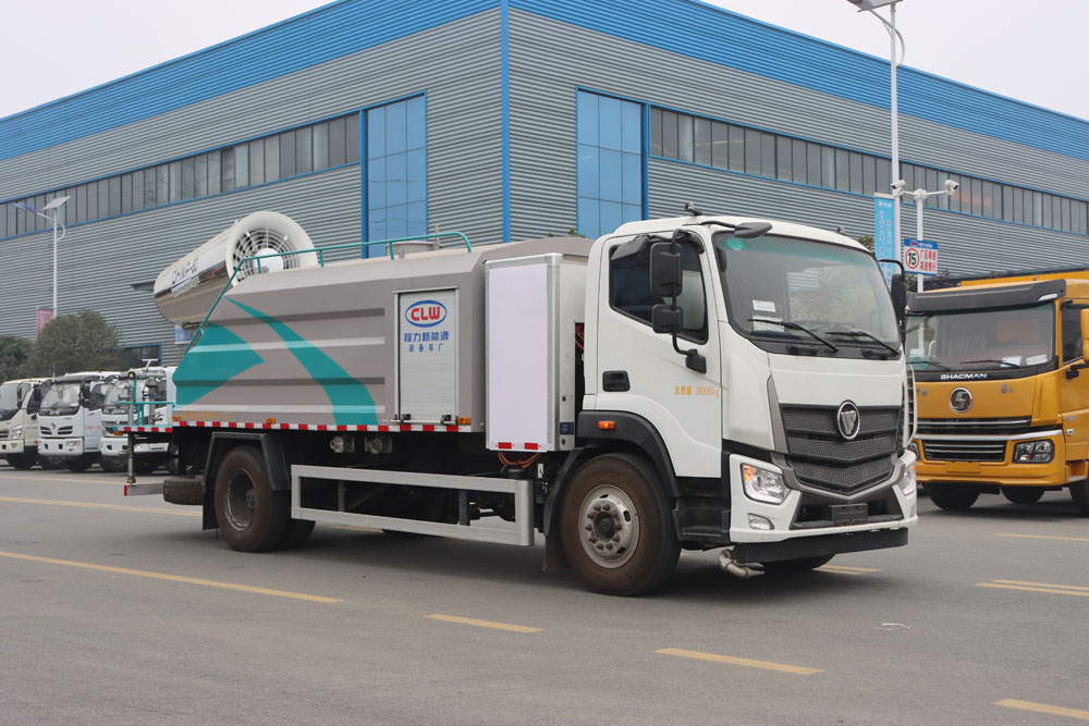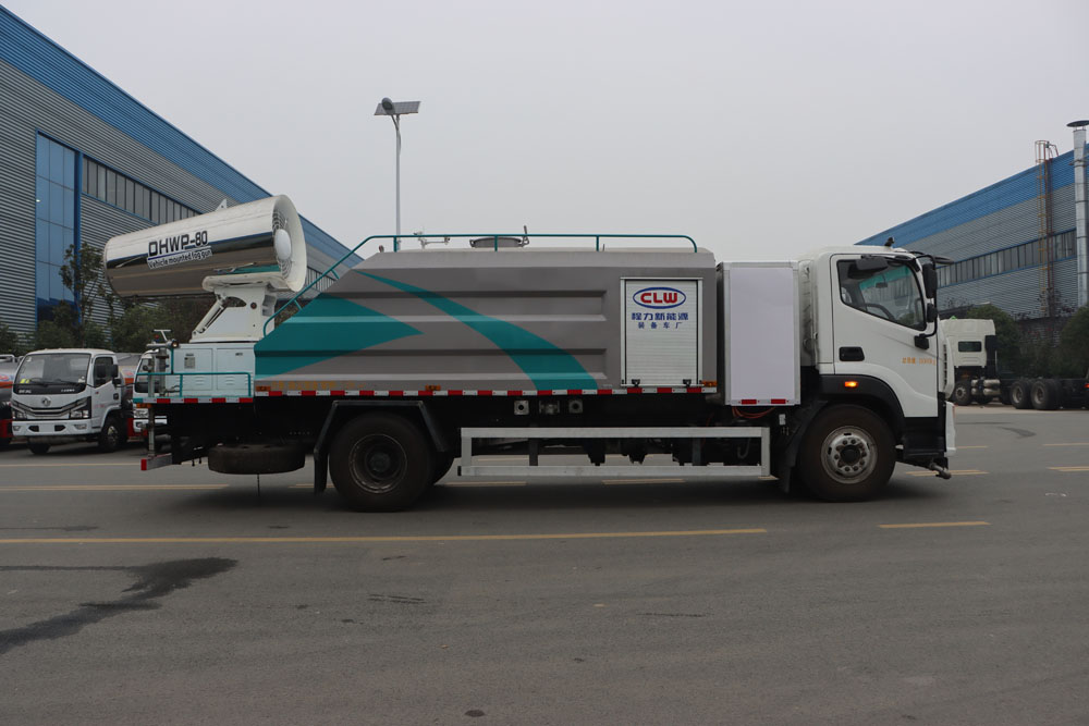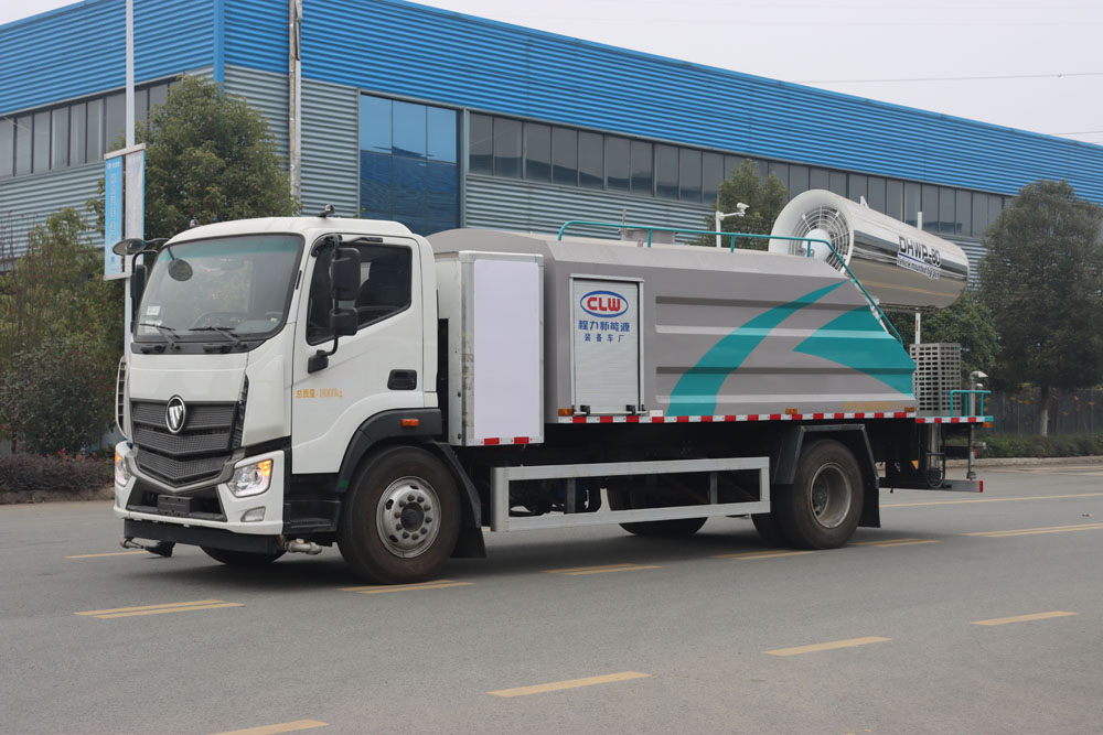 四、其他說明: 福田純電動多功能抑塵車是在純電動二類底盤的基礎上,加裝低壓沖洗、灑水系統、霧炮機組,由機械、液壓(氣路)、電器三部分合為一體的專用灑水作業車。 采用自吸式雙級離心泵,效率高、灑水寬度大、水槍射程遠,低壓水泵由底盤變速器取力器通過傳動軸直接傳動。霧炮機組由底盤電池帶動霧炮風扇電機、不銹鋼多級離心泵,進行噴霧降塵工作。
