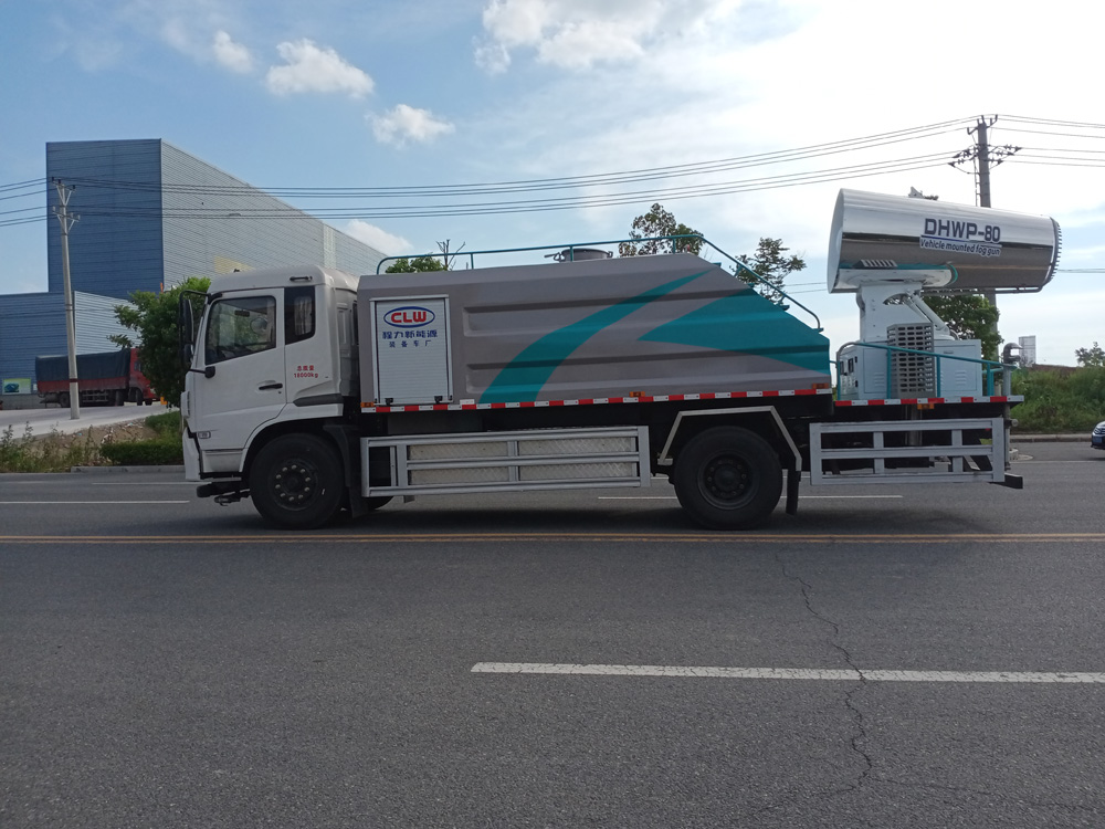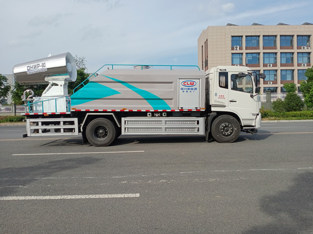 四、其他說明: 東風天錦純電動抑塵車車是在純電動二類底盤的基礎上,加裝低壓沖洗、灑水系統、霧炮機組,由機械、液壓(氣路)、電器三部分合為一體的專用灑水作業車。工作原理:采用自吸式雙級離心泵,效率高、灑水寬度大、水槍射程遠,低壓水泵由底盤變速器取力器通過傳動軸直接傳動。霧炮機組由底盤電池帶動霧炮風扇電機、不銹鋼多級離心泵,進行噴霧降塵工作。