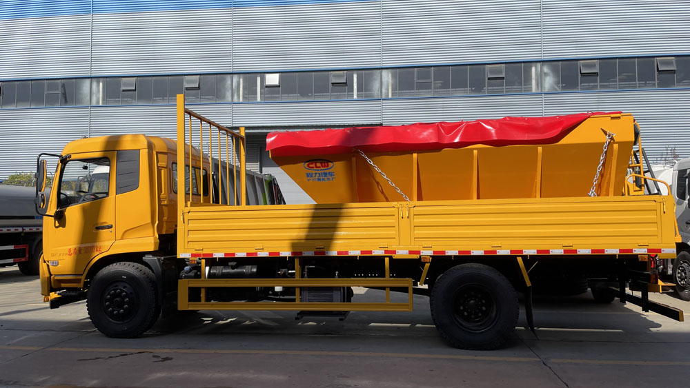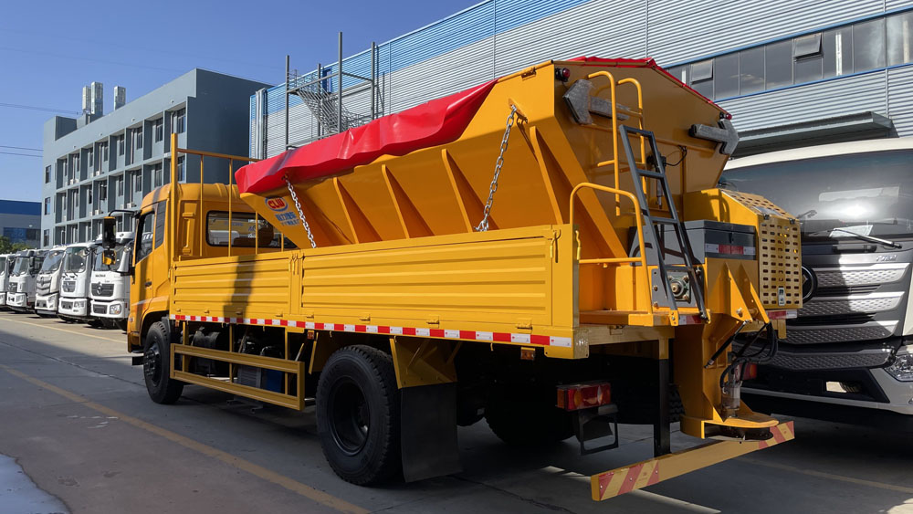 - 融雪撒布機可撒布鹽、砂、融雪劑等多種融雪物料,撒布寬度和撒布量可調節控制,計量穩定、準確、可靠,撒布寬度一般為 2-14m,撒布量為 20-300g/m² 可調 。撒布機采用碳鋼板或不銹鋼結構,具有良好的耐腐蝕性,動力組選用國內知名品牌發動機,性能穩定。其采用 V 型料倉,結構簡單可靠,使融雪劑自動落料,出料完全,無殘留,并且上置過濾網可減少大顆粒或雜物進入設備,保證機構安全運行,防滑輸送帶則保證了融雪劑輸送連續、均勻.